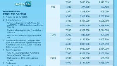 Promo yang berlangsung mulai tanggal 15 hingga 28 April 2026 ini ditujukan bagi pelanggan tegangan rendah satu fasa dengan daya awal mulai dari 450 volt ampere (VA) hingga 5.500 VA yang ingin melakukan penambahan daya hingga 7.700 VA.