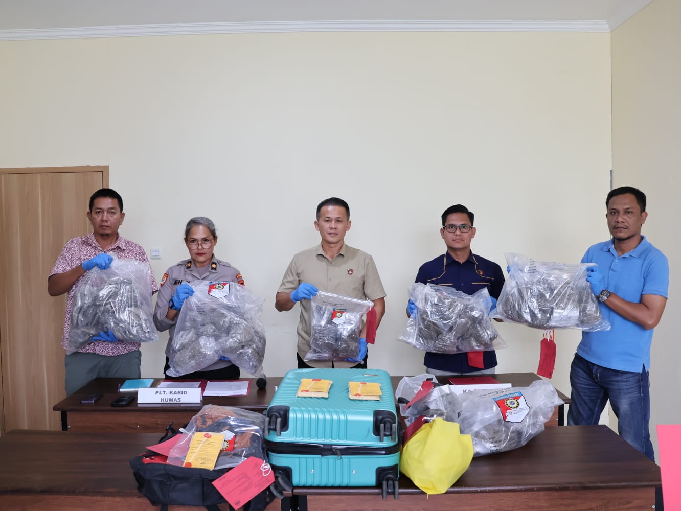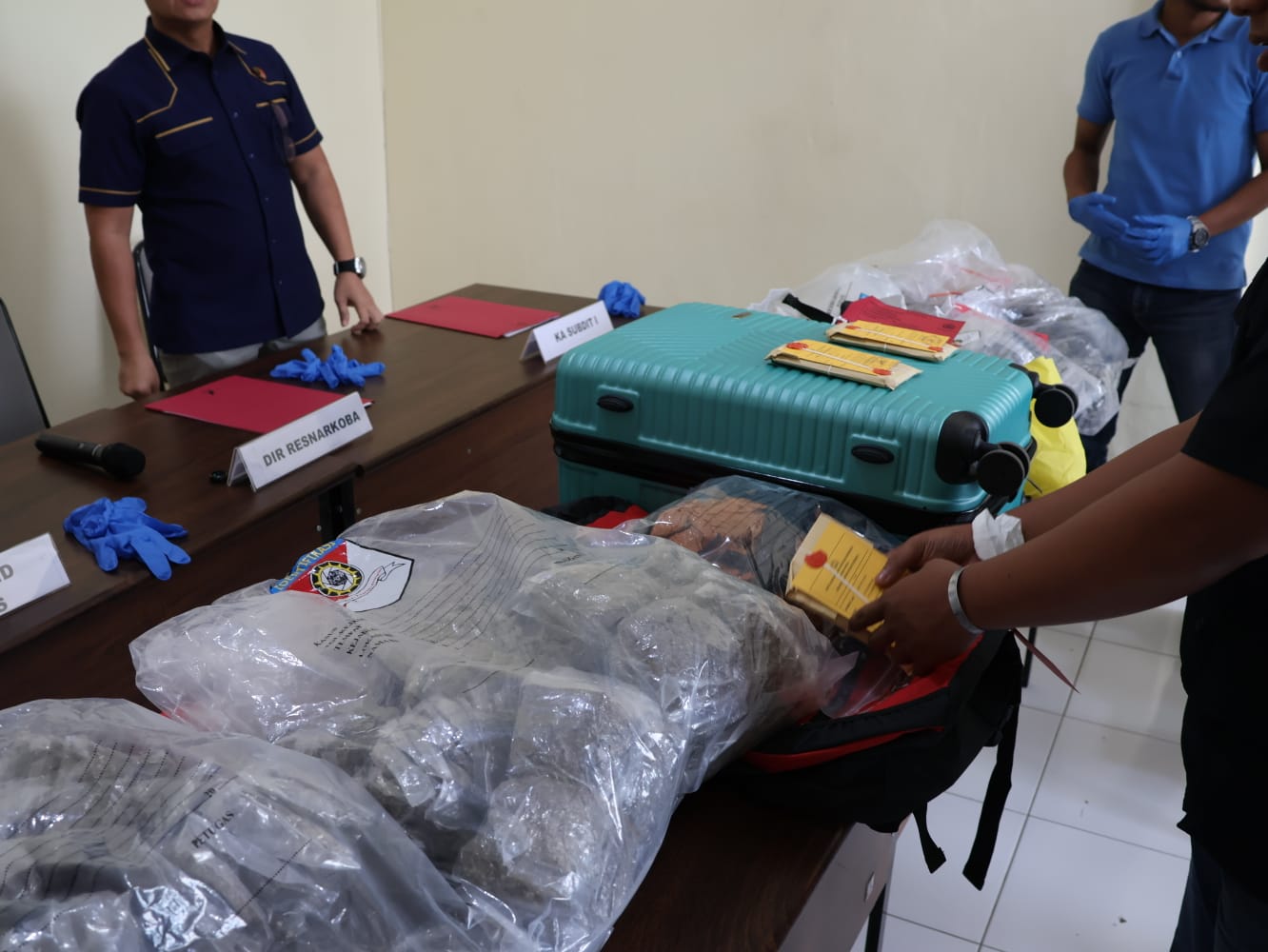 Dari tangan keduanya, polisi menyita ratusan paket ganja yang dikemas dalam plastik bening ukuran besar. Barang tersebut ditemukan di beberapa tas, di antaranya tas biru, tas jinjing putih, koper warna hijau toska, serta kantong plastik hitam. Selain itu, turut diamankan dua lakban bening dan satu unit telepon seluler.