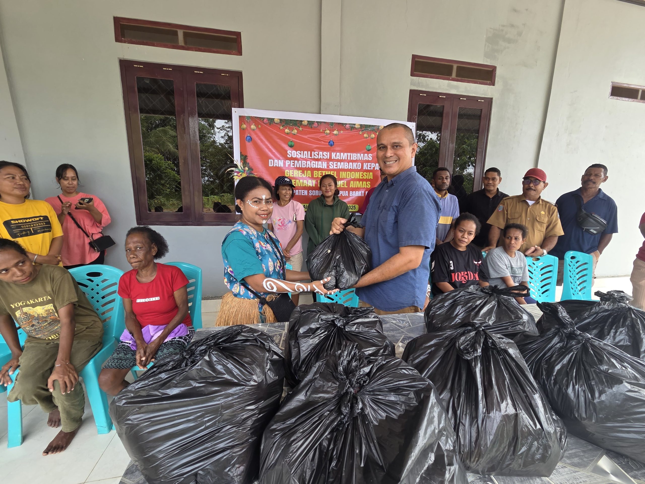 Lensapapua, Upaya menjaga keamanan dan ketertiban masyarakat menjelang Natal dan Tahun Baru terus diperkuat di Kabupaten Sorong. Pada Selasa (2/12/2025), GPDI Imanuel Aimas menjadi lokasi pelaksanaan sosialisasi kamtibmas yang dirangkaikan dengan pembagian paket sembako kepada jemaat.